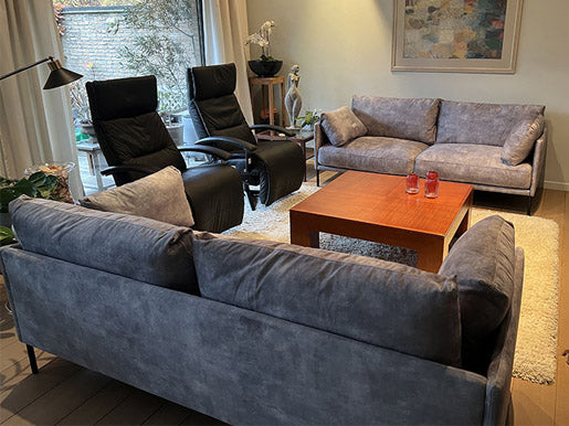 Op de foto zie je de combinatie van twee zero gravity zetels met twee Lucca's in grijs meubelstof.